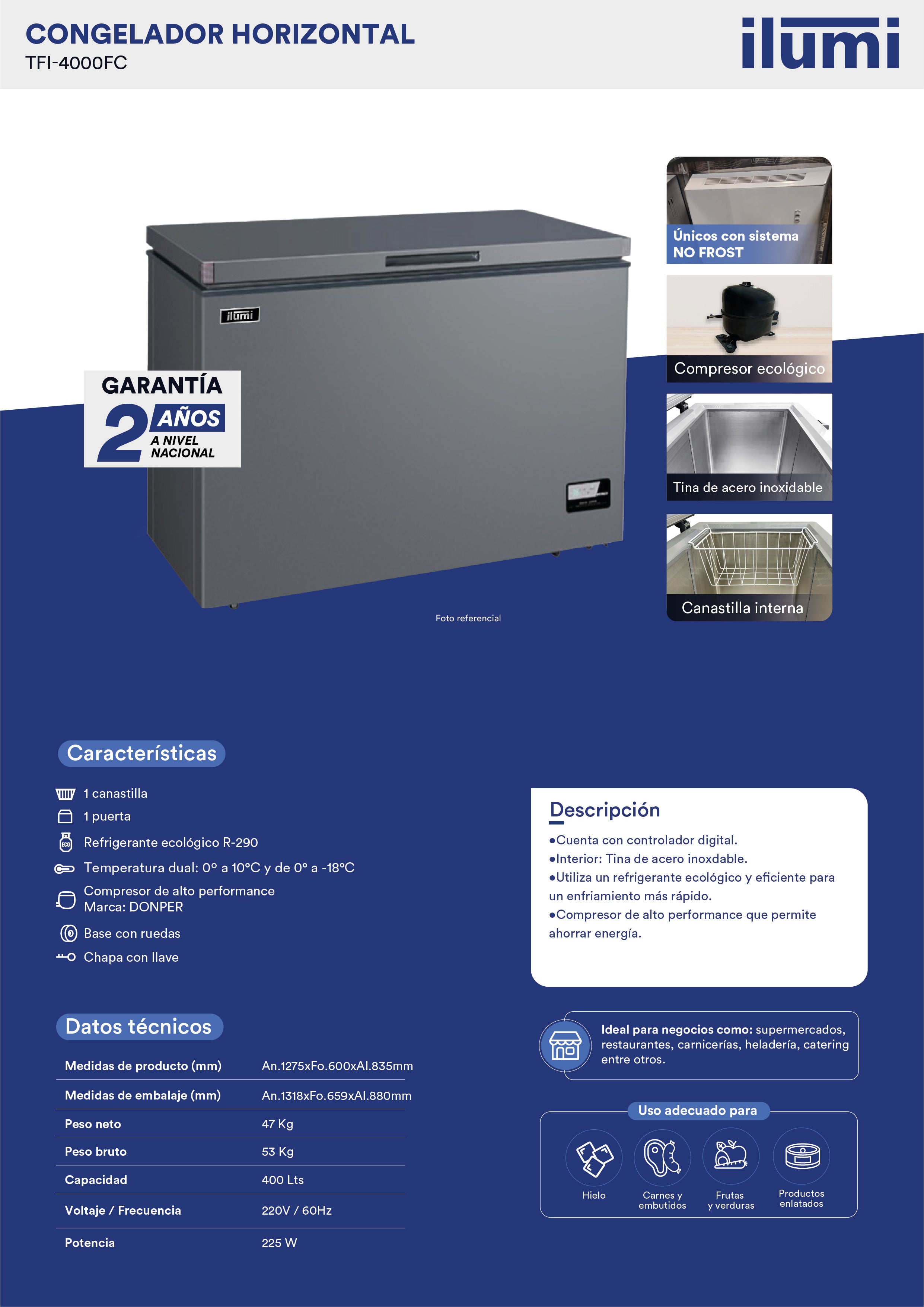 La congeladora horizontal Fan Cooling ofrece una congelación rápida y uniforme gracias a su sistema de aire forzado, evitando la formación de escarcha y manteniendo la temperatura estable en todo el espacio interior. Su diseño robusto, eficiente y de bajo consumo asegura mayor durabilidad y una mejor organización de los productos congelados. Una opción moderna y confiable.